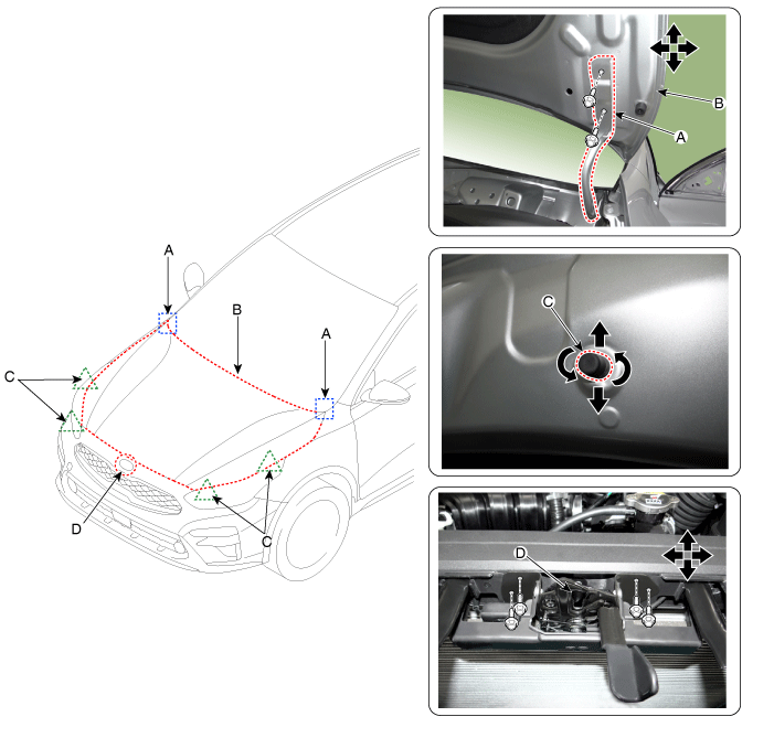 Ослабив болты крепления защелки капота (D), отрегулируйте защелку на перемещая его вверх-вниз или из стороны в сторону.