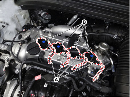 Снимите катушку зажигания, ослабив крепежные болты (В).