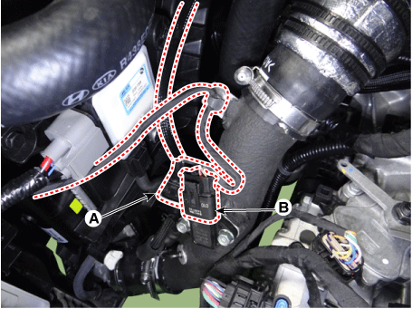 Отсоедините разъем электромагнитного клапана RCV (A) и давление наддува. разъем датчика (BPS) (B).
