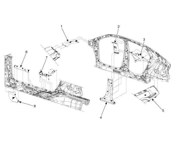 6. Накладка на порог передней двери. 7. Накладка на порог задней двери. 8. Боковая обшивка капота |