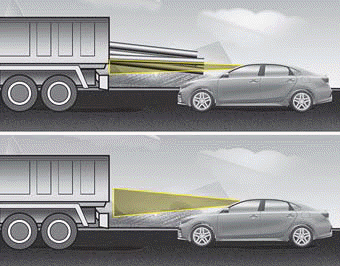 Если впереди идущий автомобиль с грузом который простирается назад от кабины, или когда впереди идущее транспортное средство имеет увеличенный дорожный просвет, доп. требуется особое внимание. Система FCA может быть не в состоянии распознать груз, отходящий от автомобиль. В этих случаях вы должны соблюдать безопасный тормозной путь от самого заднего объекта и при необходимости нажмите на тормоз педаль для снижения скорости движения в чтобы соблюдать безопасную дистанцию.