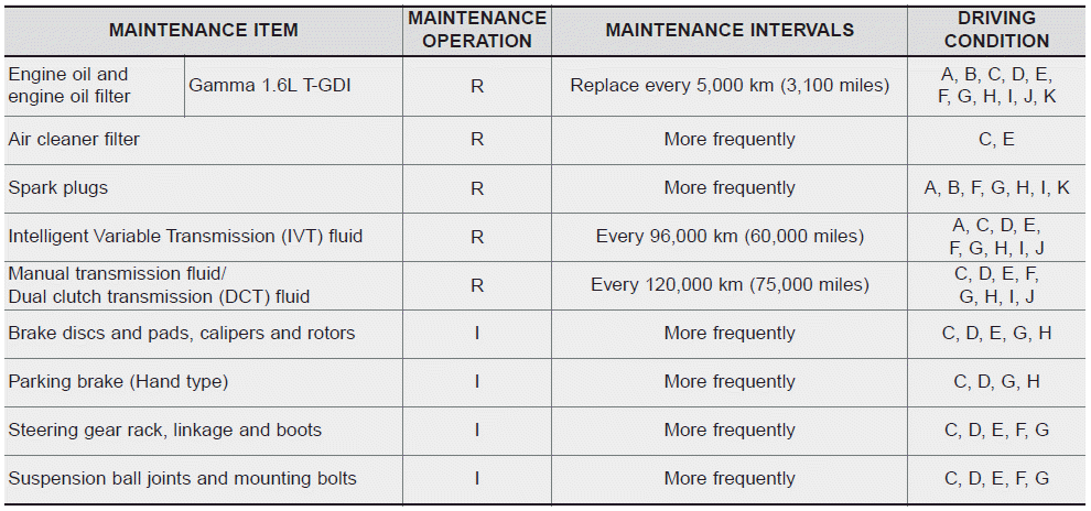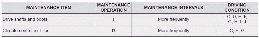Следующие элементы должны обслуживаться чаще на обычно используемых автомобилях. в тяжелых условиях вождения. Ссылаться в приведенной ниже таблице указаны соответствующие интервалы технического обслуживания.