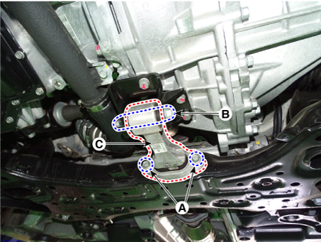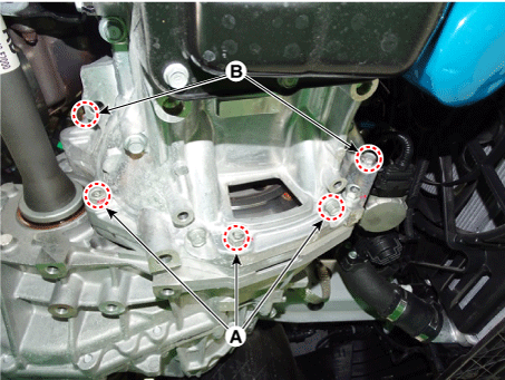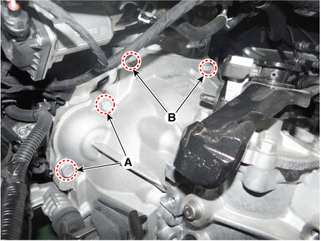 Ослабьте нижние болты крепления (А, В) нижней части коробки передач. а затем снимите коробку передач в сборе, подперев ее домкратом.