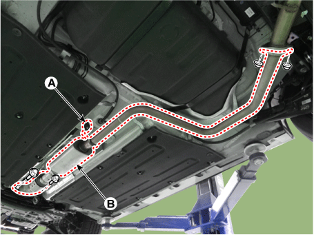 Снимите каталитический нейтрализатор и центральный глушитель (B).