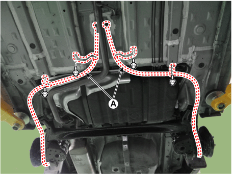 Отсоедините трос стояночного тормоза (А), ослабив болты.