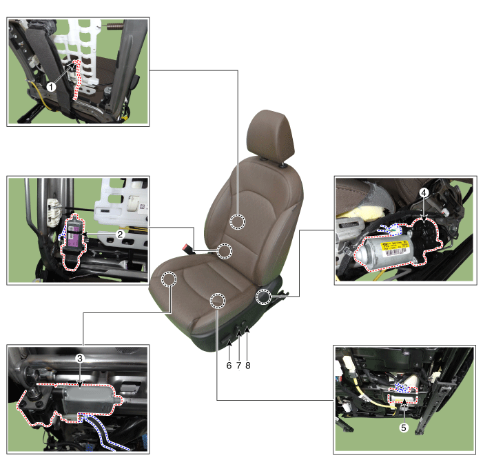 6. Переключатель подушки сиденья 7. Переключатель спинки сиденья 8. Переключатель поддержки пиломатериала |