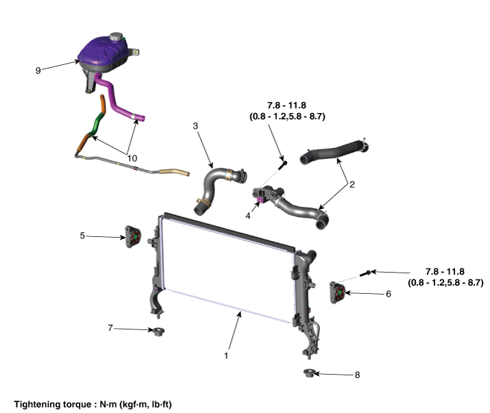 7. Верхний монтажный кронштейн радиатора [правый] 8. Кронштейн крепления радиатора верхний [левый] 9. Изолятор нижнего крепления радиатора [RH] 10. Изолятор нижнего крепления радиатора [LH] |