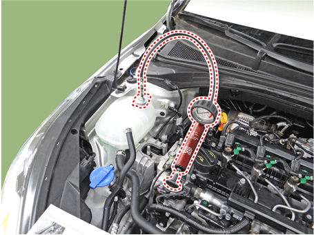 Подождите, пока двигатель не остынет, затем осторожно снимите крышку радиатора и заполните радиатор охлаждающей жидкостью двигателя, затем установите его на тестер давления.