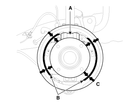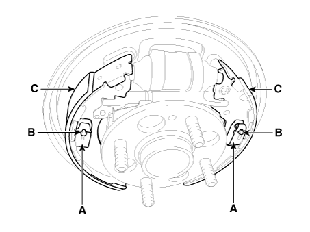Снимите пружины крепления колодок (A) и штифты крепления башмаков (B), а затем снимите тормозная колодка (С). Следите за тем, чтобы не повредить пылезащитную крышку на колесном цилиндре.