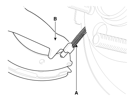 Снимите трос стояночного тормоза (А), а затем снимите тормозную колодку (В).