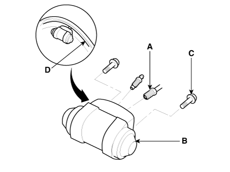 Нанесите герметик (C) между колесным цилиндром (B) и опорной пластиной (D), и установите рабочий цилиндр.