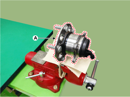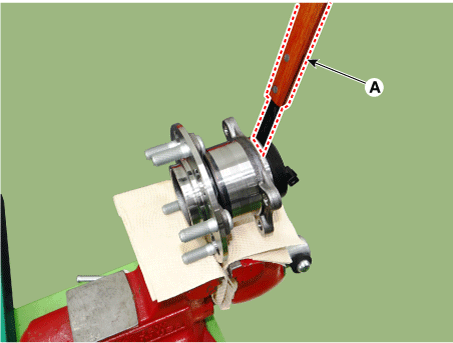 Закрепите узел подшипника задней ступицы (А) в тисках.