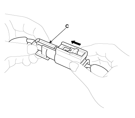 Удерживая обе половинки соединителя, нажимайте до тех пор, пока выступ (C) на стороне муфты не разъем щелкает для блокировки.