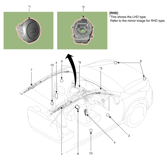 2. Часовая пружина 3. Датчик бокового удара давления (P-SIS) 4. Боковая подушка безопасности (SAB) 5. Подушка безопасности пассажира (PAB) |