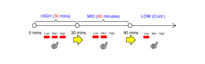 Через 30 минут переключите на «СРЕДНИЙ» в «ВЫСОКИЙ», затем на «НИЗКИЙ» через 60 минут. в "МИД" |