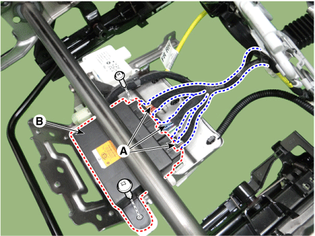 Снимите блок отопителя (В), ослабив винты после отсоединения. разъем (А).