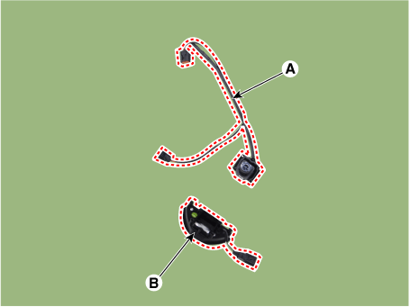 Снимите камеру заднего вида и ручку крышки багажника в сборе (В), ослабив винты после отсоединения разъема (A).