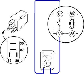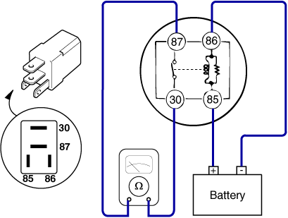 Подайте 12 В на клемму 85 и заземлите на клемму 86, а затем проверьте для непрерывности между клеммами (30 и 87).