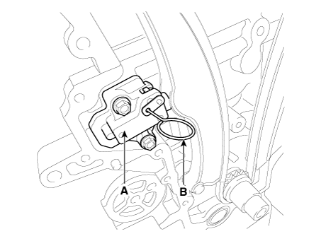 Установите автоматический натяжитель цепи ГРМ (А) и снимите штифт (В).