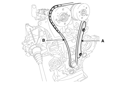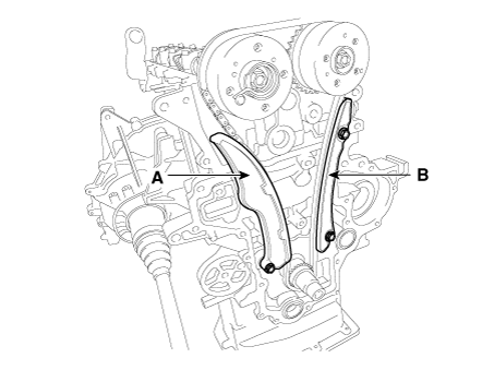 Снимите рычаг натяжителя цепи ГРМ (А) и направляющую (В).