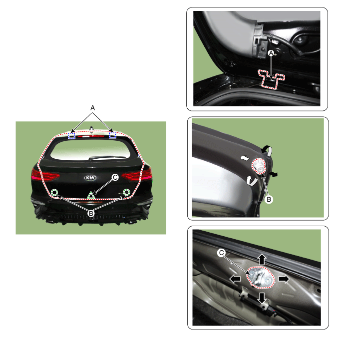 Ослабив крепежные болты фиксатора задней двери (С), отрегулируйте заднюю дверь. бойка, перемещая его вверх или вниз, вправо или влево.
