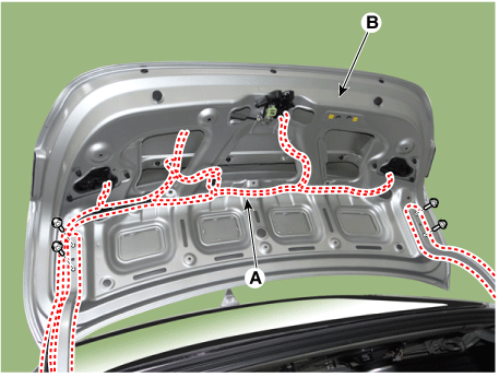 Ослабив крепежные болты, снимите крышку багажника в сборе (В).