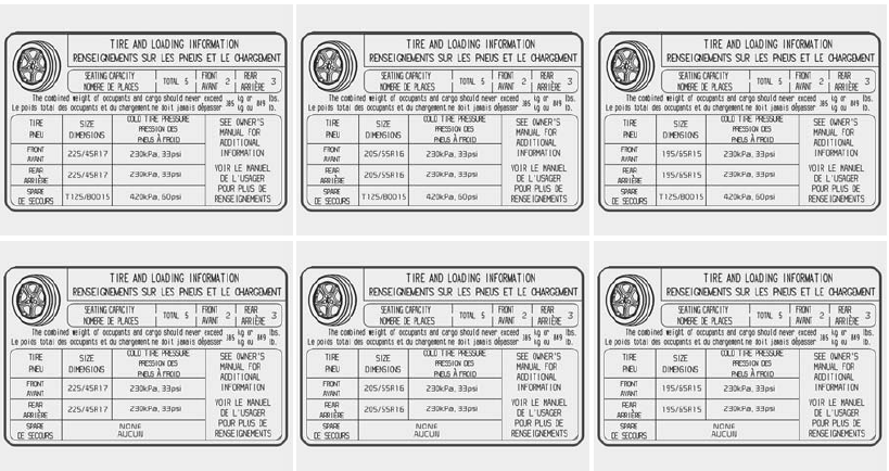 Наклейка, расположенная на пороге двери водителя, указывает исходный размер шин. рекомендуется давление в холодных шинах для вашего транспортного средства, количество людей, которые могут находиться в вашем транспортном средстве и транспортном средстве емкость масса.