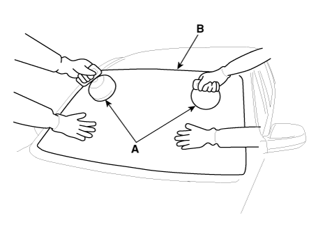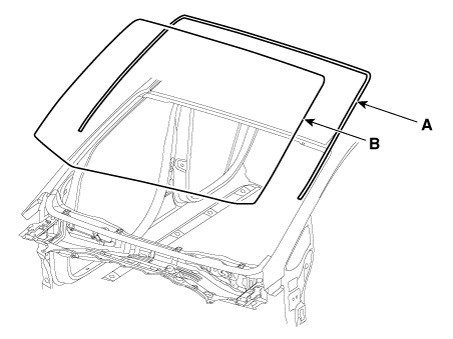 Нанесите полоску герметика (B) вокруг ветрового стекла (A).