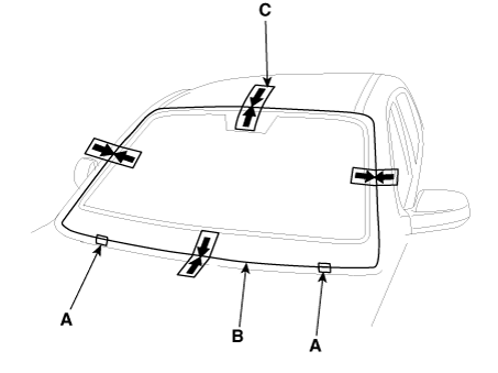 С помощью держателя стекла (А) отрегулируйте ветровое стекло (В) по размеру. установочные метки (C) на кузове и слегка нажмите на ветровое стекло, чтобы сделайте края полностью сидящими на склеиваемой поверхности тела.