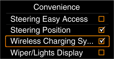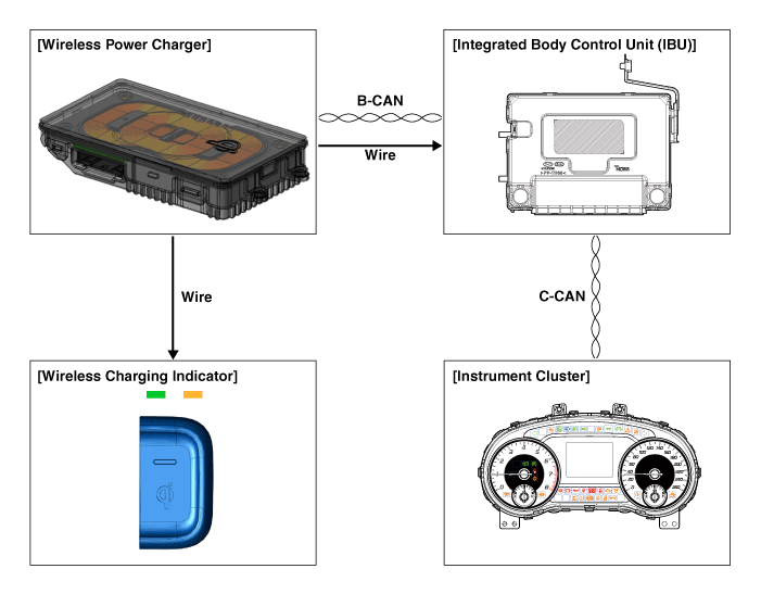 Во время ACC или IG ON напряжение батареи подается на беспроводное зарядное устройство. система для передачи выходной мощности 5 Вт на мобильный телефон.