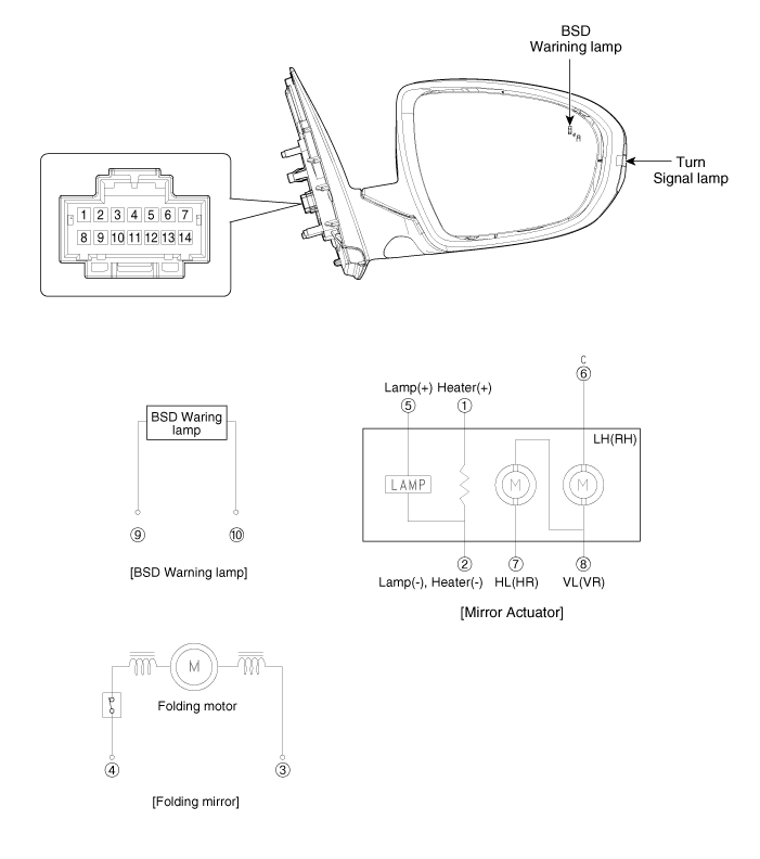 Снятие 1. Отсоедините отрицательную (-) клемму аккумуляторной батареи. 2. Снимите зеркало (C) с держателя зеркала после отсоединения разъема обогревателя (A) и разъема предупреждения BSD (B). 3. Убираем предупреждение BSD...