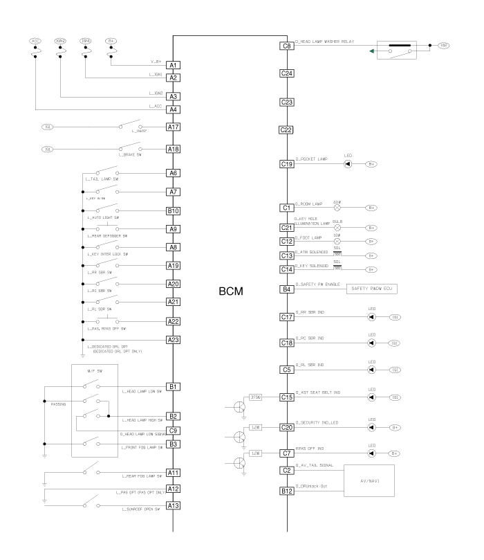 Компоненты Информация о выводах разъема № Разъем A (24 контакта) Разъем B (20 контактов) Разъем C (24 контакта) 1 Аккумулятор (+) Переключатель ближнего света фар Комнатная лампа 2 IGN 1 Переключатель дальнего света фар AV задний сигнал 3 IGN 2 Передние ...