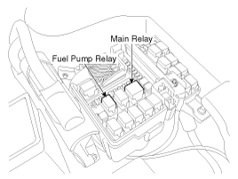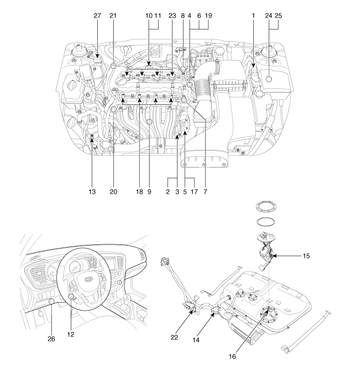 15. Датчик уровня топлива (ДУТ) 16. Датчик давления в топливном баке (FTPS) 17. Двигатель ETC [интегрирован в модуль ETC] 18. Инжектор 19. Электромагнитный клапан управления продувкой (PCSV) 20. Масляный регулирующий клапан CVVT (OCV) [ряд 1/впуск] 21. Масляный регулирующий клапан CVVT (OCV) [ряд 1/выхлоп] 22. Клапан закрытия канистры (CCV) 23. Катушка зажигания 24. Главное реле 25. Реле топливного насоса 26. Разъем канала передачи данных (DLC) [16-контактный] 27. Многоцелевой контрольный разъем [20 контактов] |