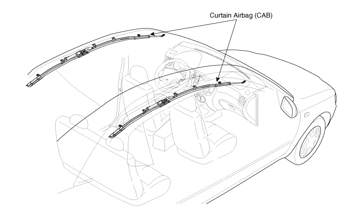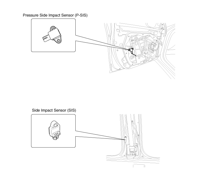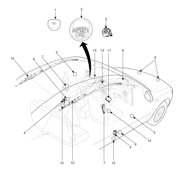 2. Рулевое колесо 3. Часовая пружина 4. Преднатяжитель ремня безопасности (BPT) 5. Датчик бокового удара давления (P-SIS) 6. Датчик бокового удара (SIS) 7. Боковая подушка безопасности (SAB) 8. Подушка безопасности пассажира (PAB) |