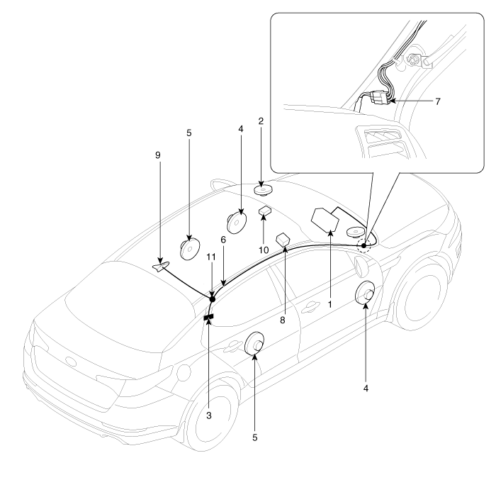 7. Соединительный соединитель фидерного кабеля 8. Мультимедийный разъем 9. Антенна на крыше (SDARS) 10. Микрофон для громкой связи (встроенный OHC) 11. Соединительный соединитель удлинительного и питающего кабеля |