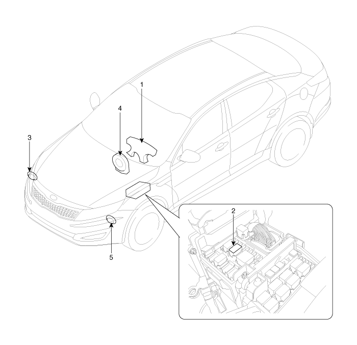 2. Реле звукового сигнала (моторный отсек) 3. Рог (низкий) |