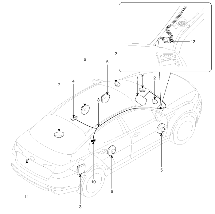 8. Кабель питания антенны 9. Центральный динамик 10. Стеклянная антенна (Радио) 11. Камера заднего вида 12. Соединитель фидерного кабеля |