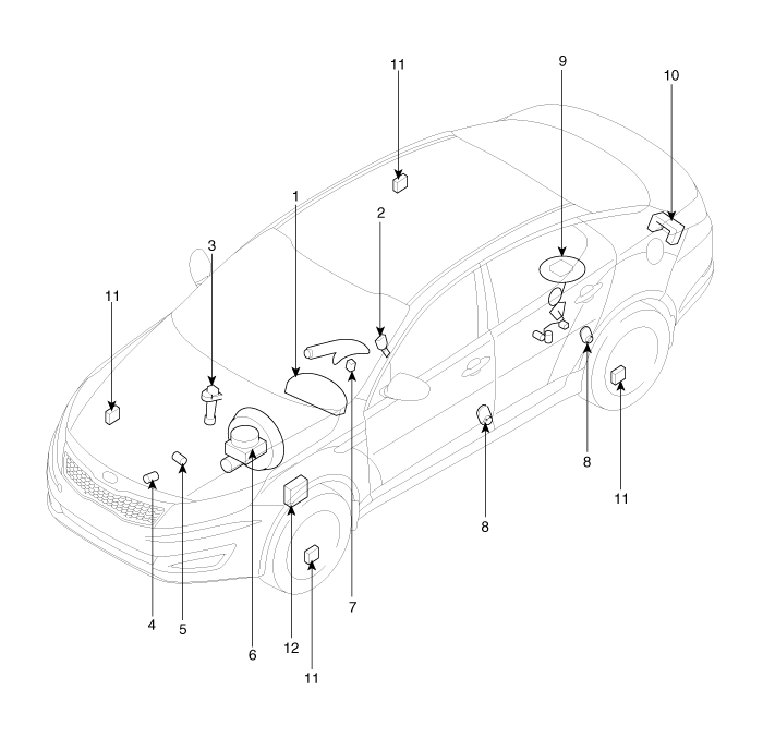 8. Дверной выключатель 9. Датчик уровня топлива 10. Переключатель открытия крышки багажника 11. Датчик скорости вращения колеса 12. ЭБУ АБС |