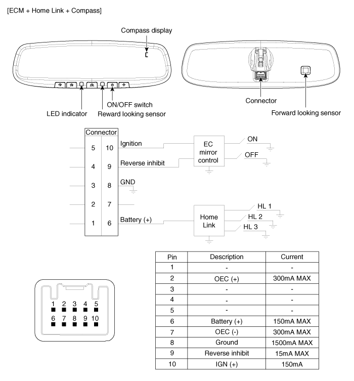 Описание ECM (электрохроматическое внутреннее зеркало заднего вида) предназначено для уменьшения яркости света, отражающегося от движущегося сзади автомобиля, в темное время суток, предотвращая ослепление светом. Передний датчик определяет яркость ...