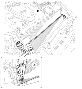 Отсоедините штифт (А) и снимите конденсатор (С) с радиатора (В).
