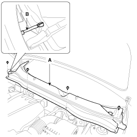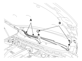 Осмотр 1. Снимите верхнюю крышку кожуха. (Обратитесь к стеклоочистителю) 2. Отсоедините разъем антиобледенителя ветрового стекла (A) от тяги электродвигателя стеклоочистителя. 3. Проверьте целостность цепи между клеммами линий антиобледенителя. 4. Включите зажигание и включите обогреватель ветрового стекла, затем измерьте напряжение между ...