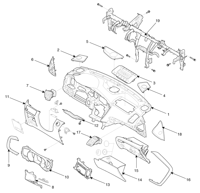 9. Украшение Crash pad [LH] 10. Приборная панель кластера 11. Нижняя панель аварийного щитка 12. Усиливающая панель 13. Верхняя панель центральной панели 14. Перчаточный ящик |