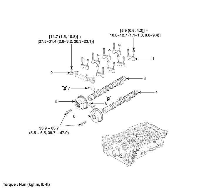 6. Впускной CVVT в сборе 7. Верхний подшипник выпускного распредвала 8. Нижний подшипник впускного распредвала |