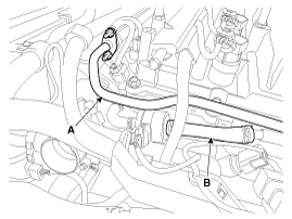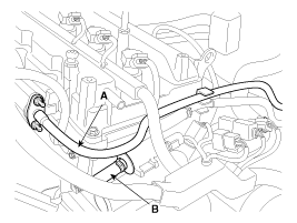 Отсоедините топливный шланг (А) и шланг (В) электромагнитного клапана управления продувкой (PCSV).