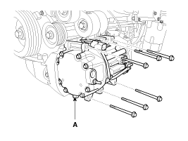 Отсоедините разъем низкого напряжения компрессора, затем снимите 6 крепежных болтов и компрессор (А).