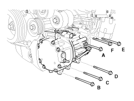 Убедитесь в длине крепежных болтов компрессора, а затем затяните их в порядке A>B>C>D>E>F.