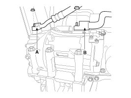 Отсоедините топливный шланг (А) и шланг (В) электромагнитного клапана управления продувкой (PCSV).