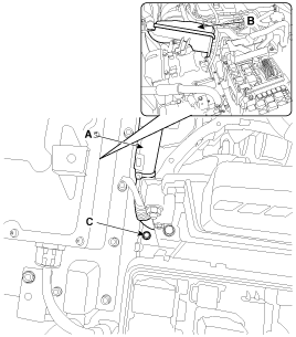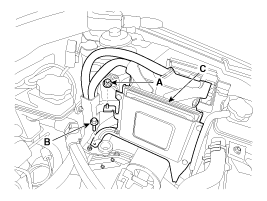 Снимите ECM (C), ослабив гайку (A) и болт (B).
