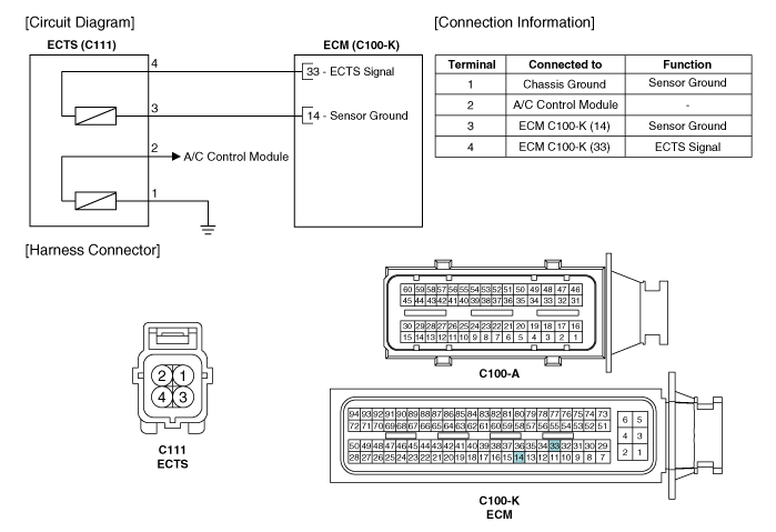 Проверка 1. Выключите зажигание. 2. Отсоедините разъем ECTS. 3. Удалите ECTS. 4. После погружения термистора датчика в охлаждающую жидкость двигателя измерьте сопротивление между ECTS...