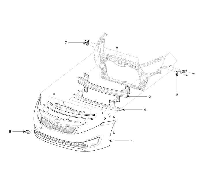 6. Боковая скоба переднего бампера [левая] 7. Боковая скоба переднего бампера [правая] 8. Орнамент КИА |
